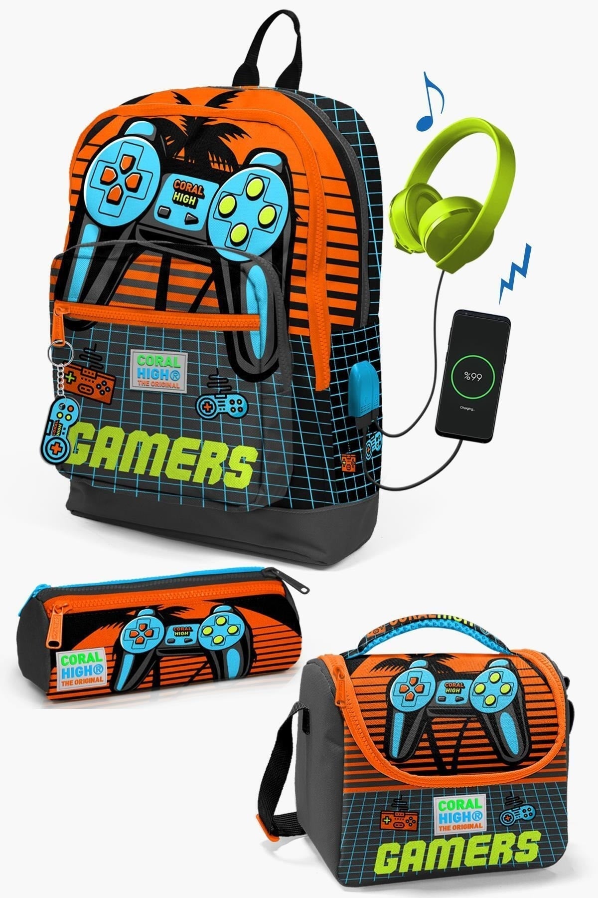 Kids Gray Orange Gamer Patterned Usb 3 Pcs School Bag Set Set0123846