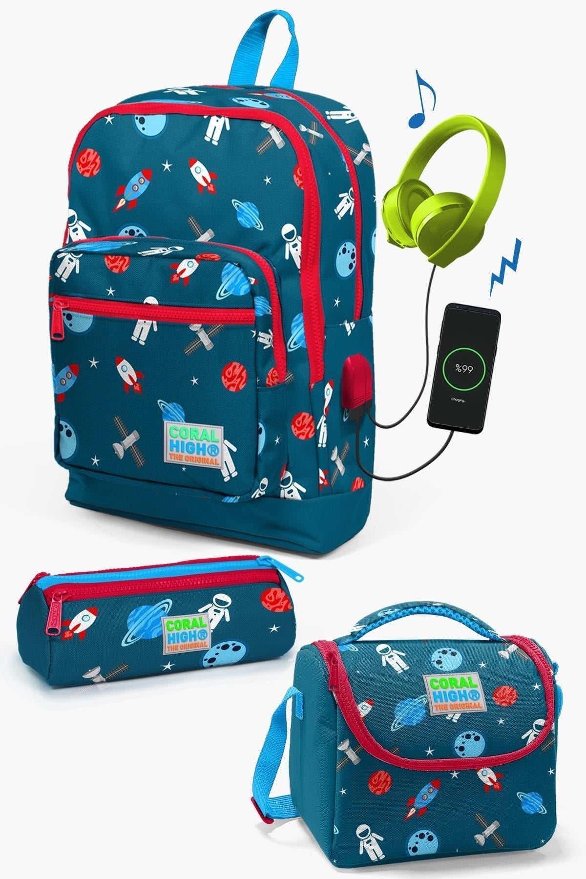 Kids Indigo Red Space Patterned Usb 3-Piece School Bag Set Set0123290