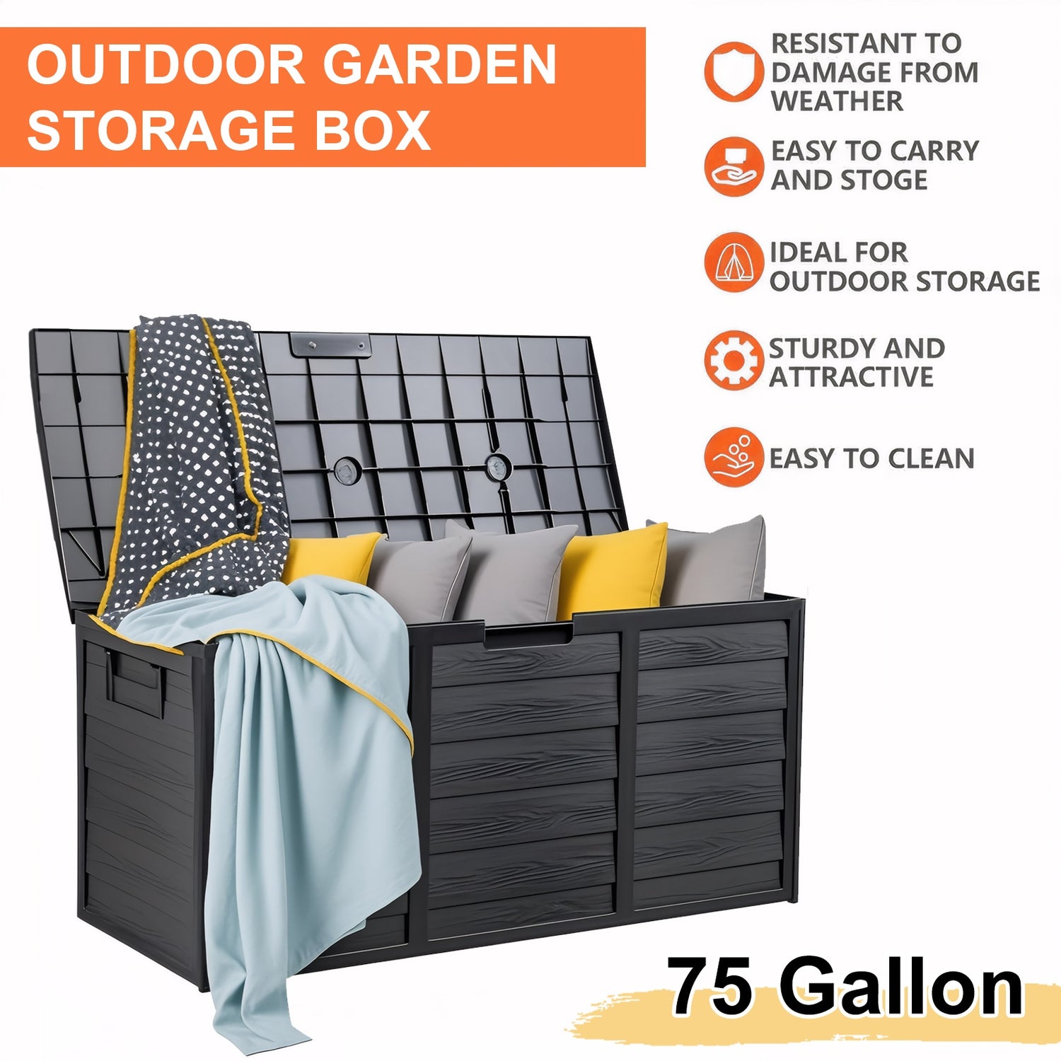 75 Gallon Heavy-Duty Waterproof Outdoor Storage Box with Flip-Top Lid, Heavy-Gauge Nylon Deck Box & Rack System - Large Capacity Mobile Cabinet with Handles & Wheels for Pool, Garden, Patio, Campin.... This product is made from high-quality materials and designed for long-term use. It provides comfort, efficiency, and durability in everyday life, whether at home, work, or outdoors. Its functional and modern design ensures maximum satisfaction. Order now and feel the difference!