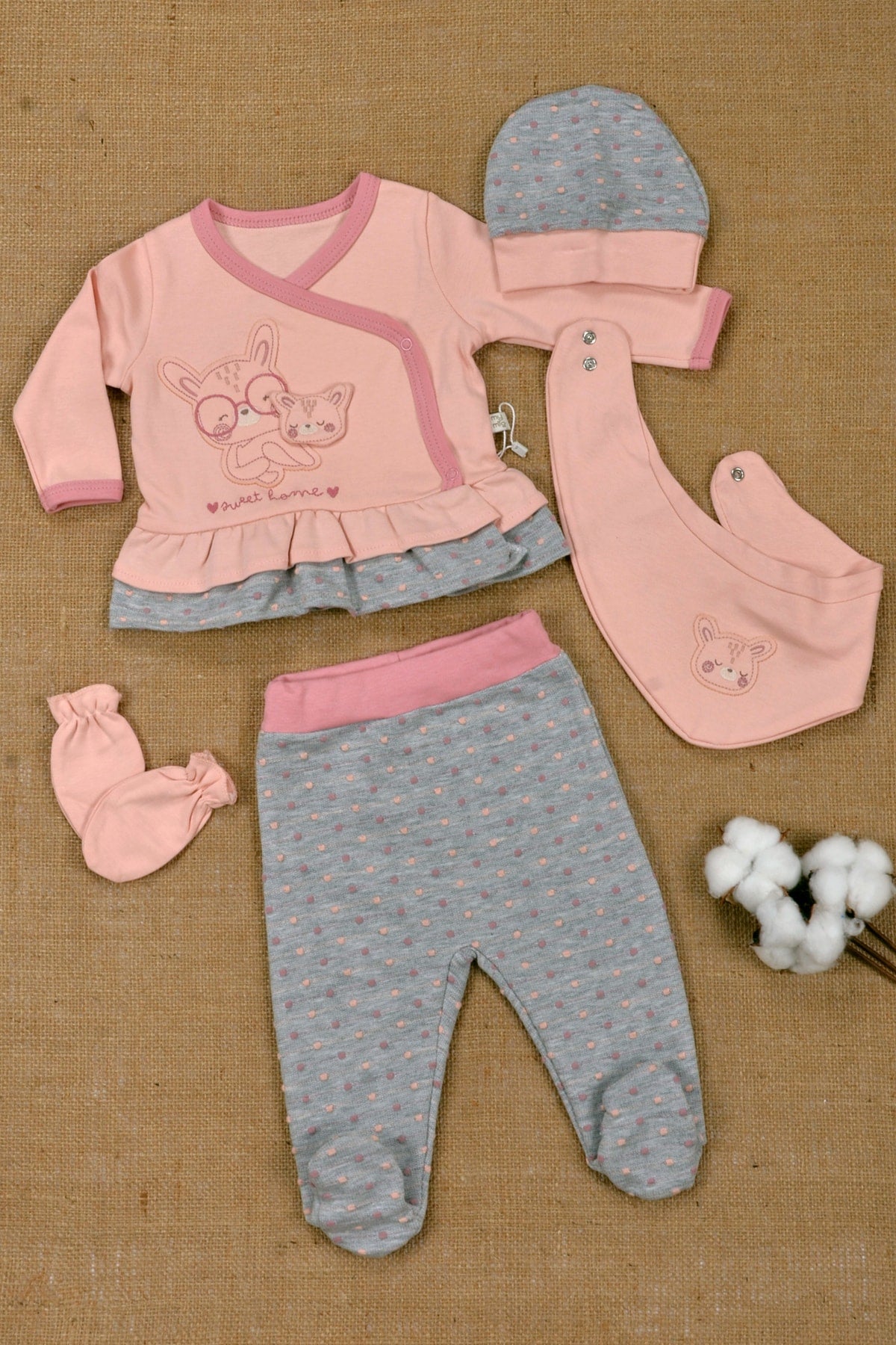 100% Cotton, Teddy Bear Embroidery, Ruffle Skirt 5 Piece Newborn Set & Out Of Hospital 0-3 Months