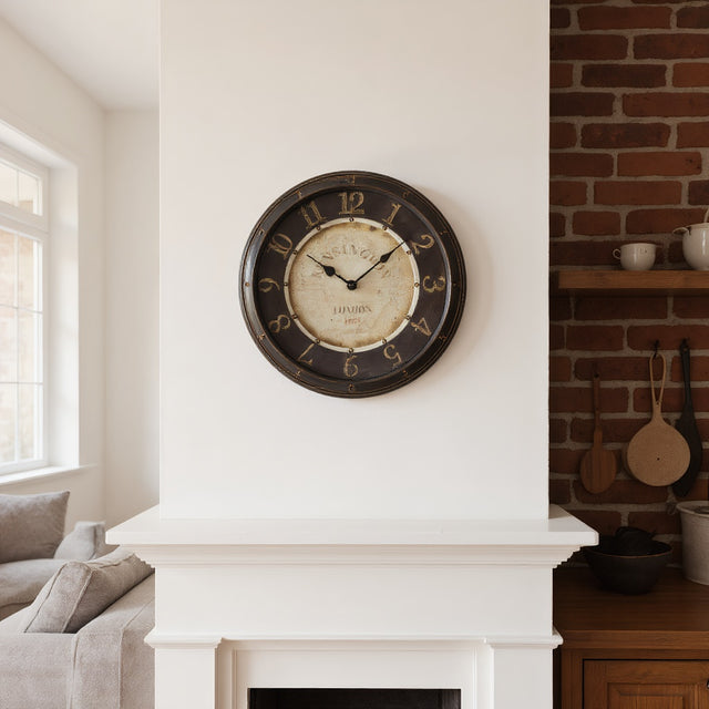 16 round wall clock antique brown plastic frame glass numerical markings metal hands old world background non-ticking quartz 1 AA Battery not included transitional no assembly
