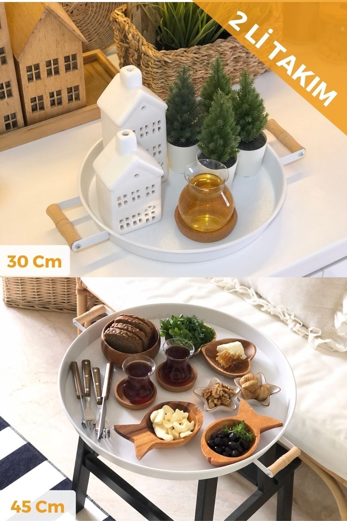 Kitchen trend, which will be at hand for both your breakfasts and tea and coffee presentations, 45 cm metal tray with 2 wooden handles and 30 cm white tray tea coffee presentation tray product usage · our 45 cm tray will accompany you in breakfast and meal services. our 30 cm tray accompanies your tea and coffee services. you can also use it to display your decorative accessories in your home. product dimensionswhite45 cm (excluding handles)white30 cm (excluding handles)materialmetal handlewood does not rust. our trays are rough painted, rough paint minimizes the possibility of slipping of the products on it while serving. cleaning of the tray it is not suitable for washing in the dishwasher. Improved version for clearer understanding and better search visibility. Suitable for users seeking detailed and reliable product information.
