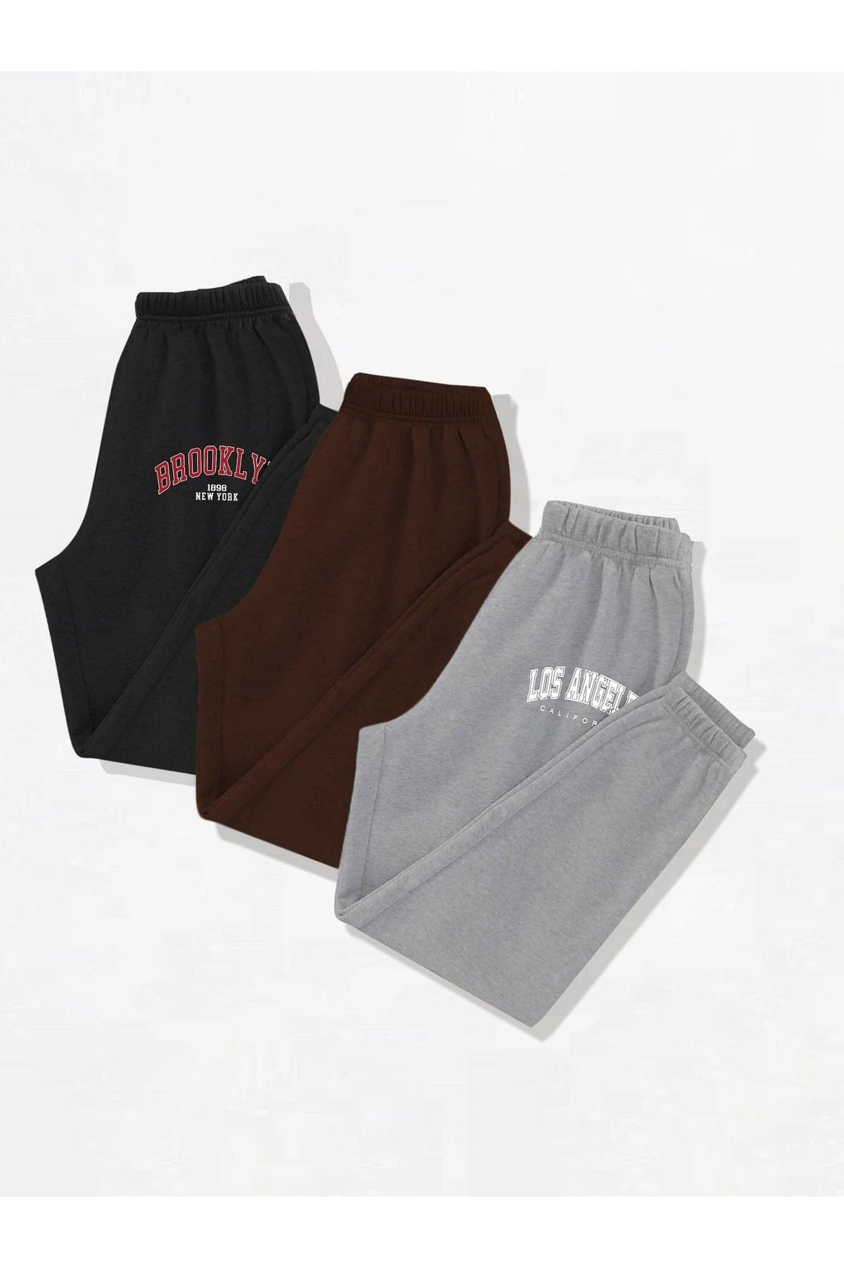 3-Pack City Printed Jogger Sweatpants - Black, Gray And Brown, Elastic Legs, High Waist, Summer
