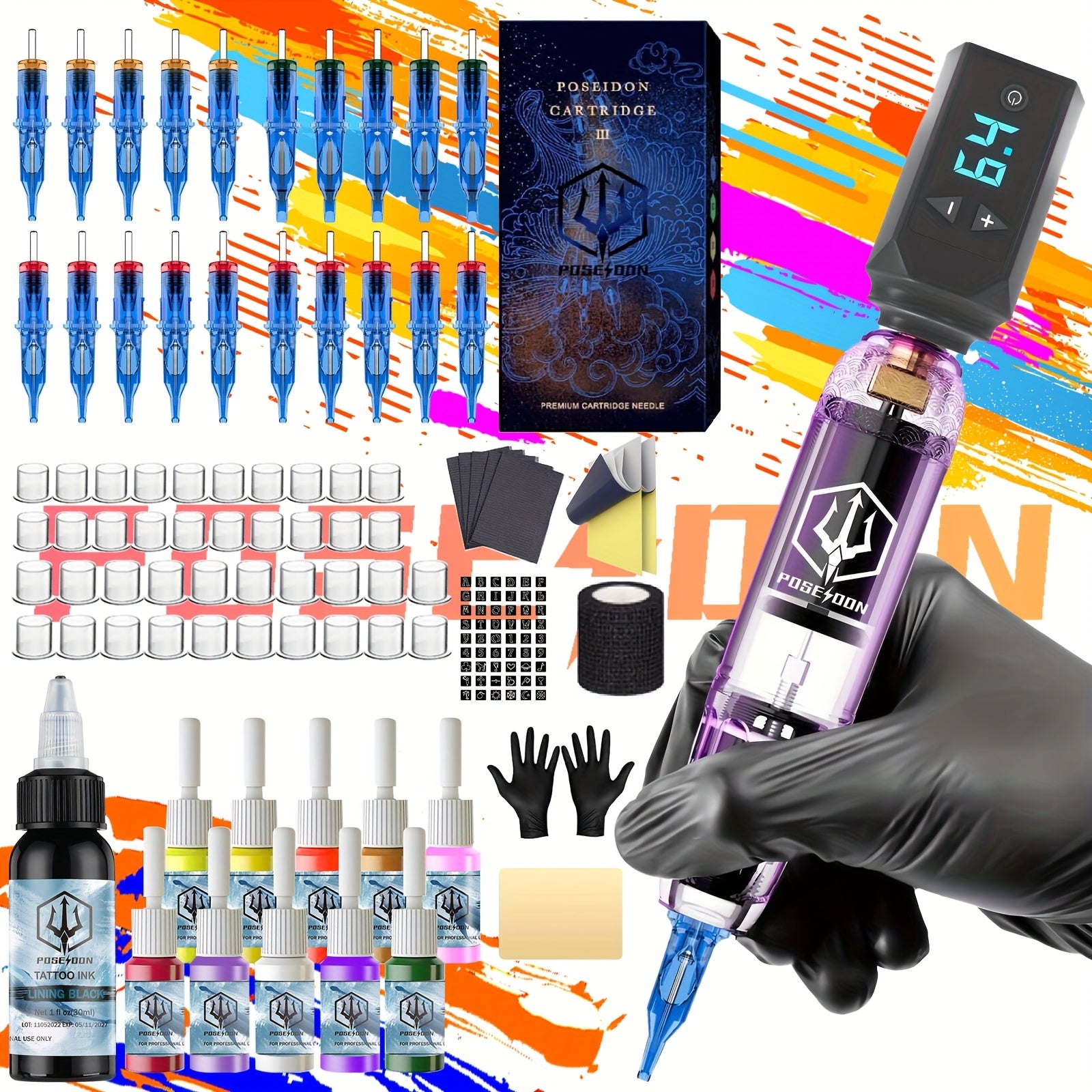 POSEIDON Tattoo Machine Kit Tattoo Gun Kit Complete Set With 20 Tattoo Needles 1500mAh Battery, Tattoo Machine Cordless Tattoo Machine Tattoo Supplies 11 Tattoo Inks Complete Cordless Machine For...