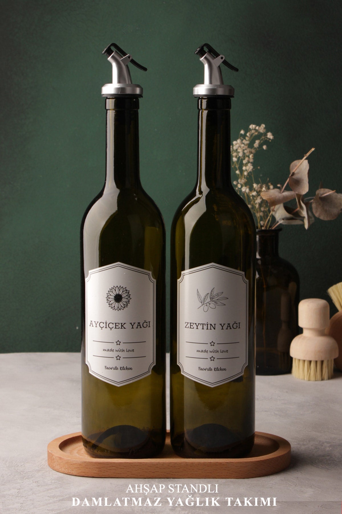 Amber 2 Pieces 750 Ml Olive Oil Oil Bottle With Wooden Stand - Glass Oil Holder Set With Wooden Base And Label