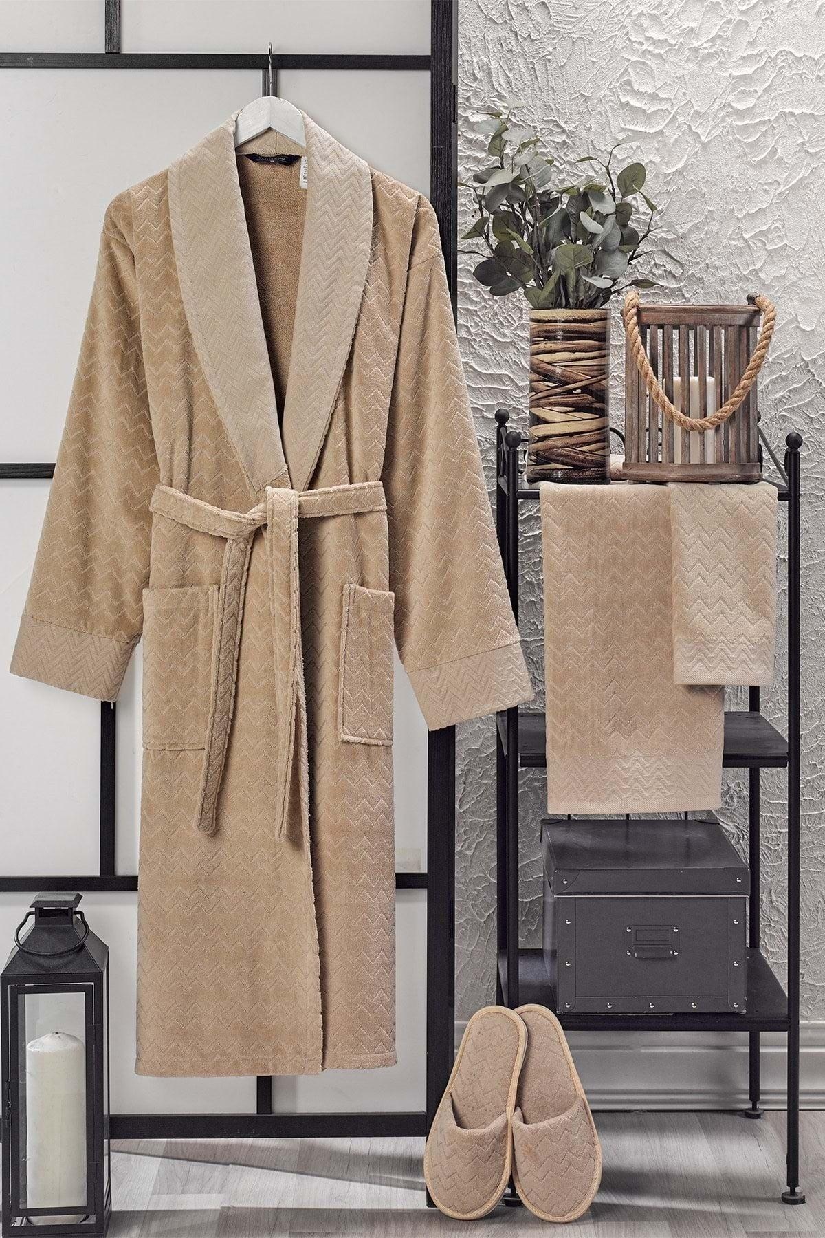 Ansaaj Velvet Jacquard 4 adet bornoz seti bej