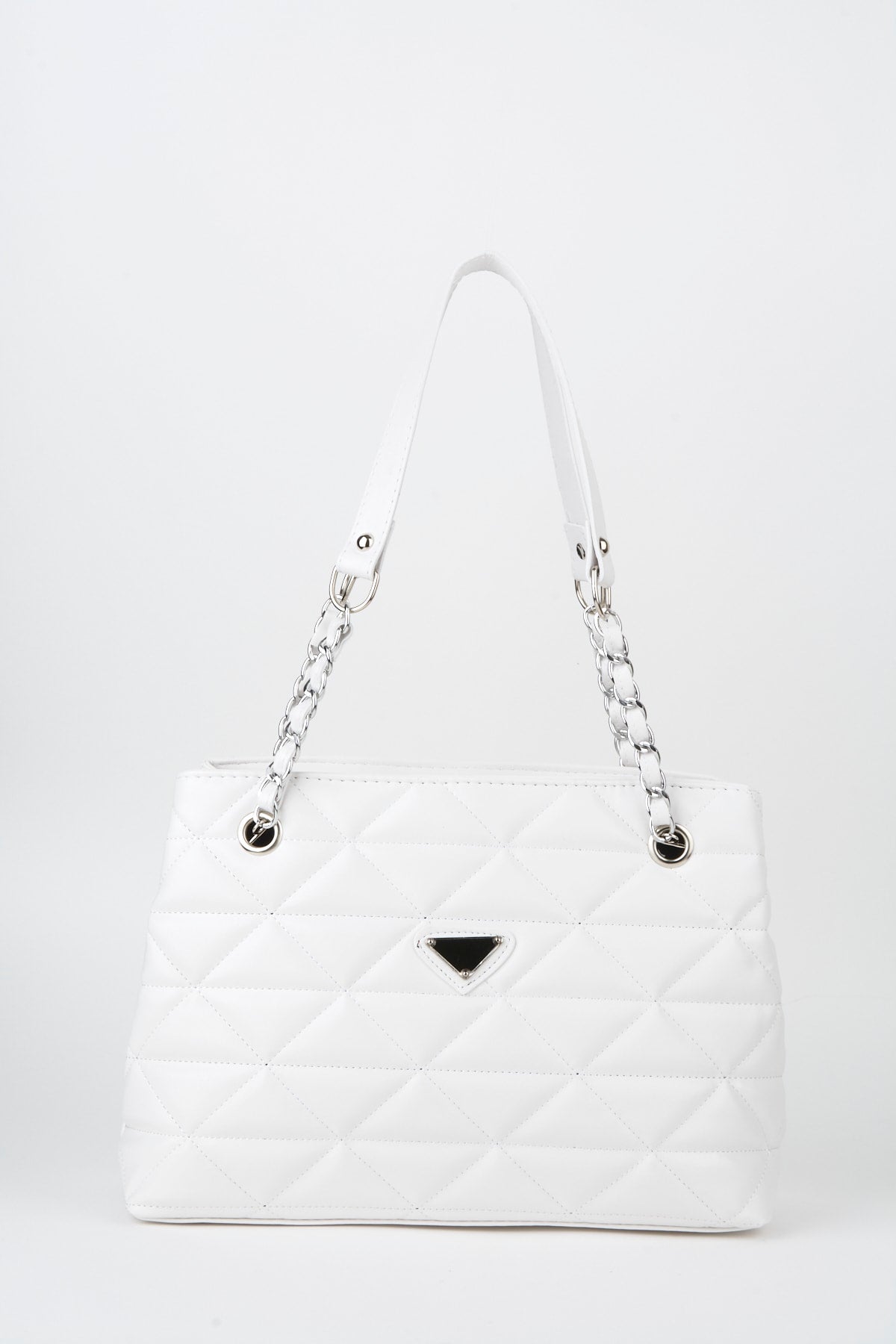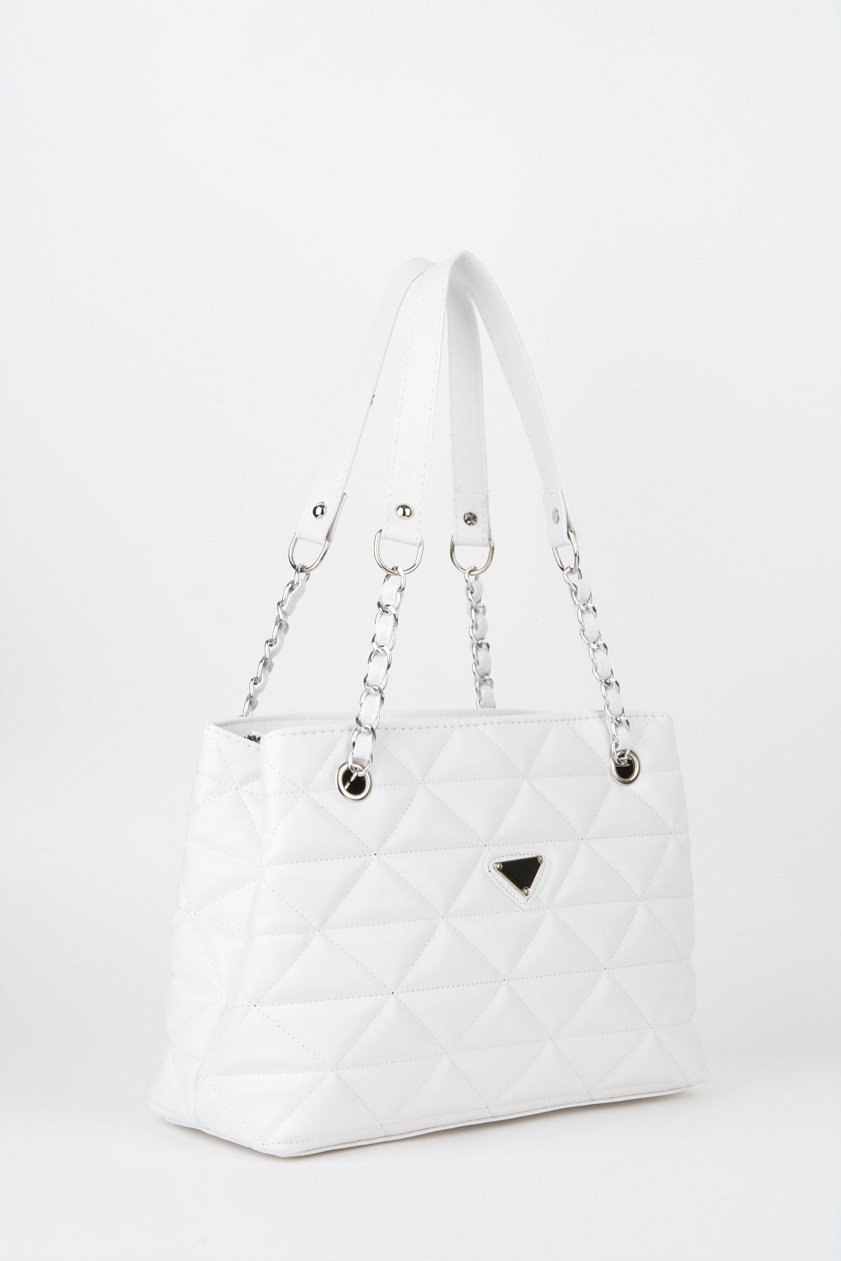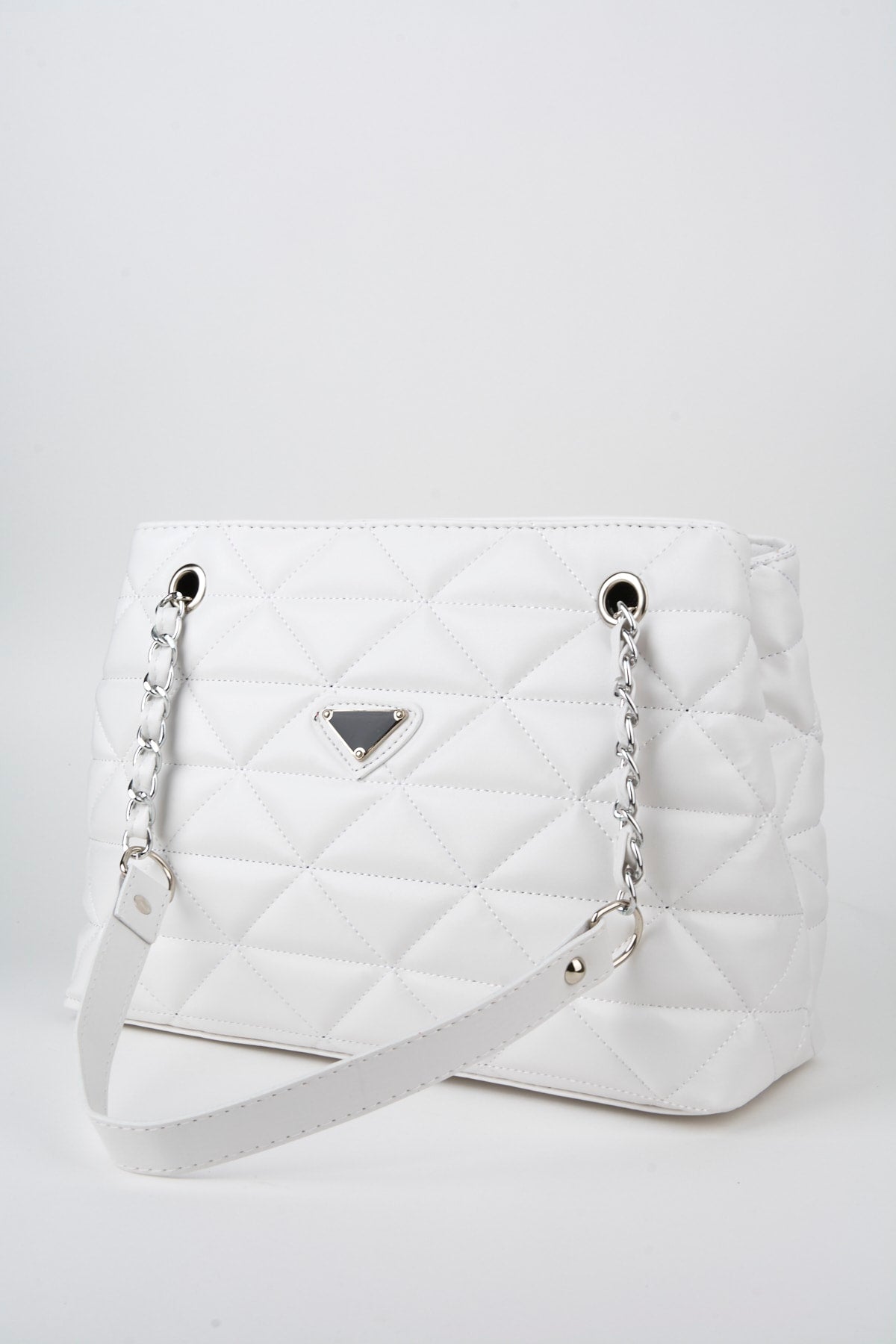 Crocos White Leather Quilted 3 Compartment Zipper Closure Lined Hand Arm And Shoulder Bag With Chain Strap