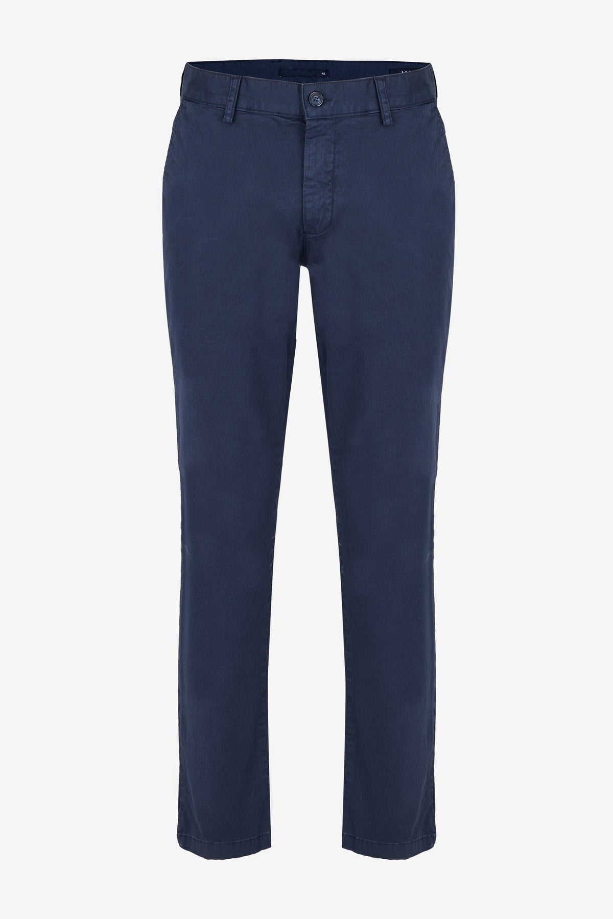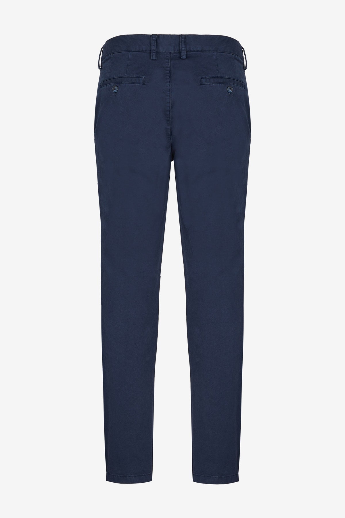 Collection chino trousers with cotton blended fabric are in navy blue color. the piping design features button/zip closure at the belt loop waist. this model has side and back pockets. pattern name: plain component: 3% elastane, 97% cotton Improved version for clearer understanding and better search visibility. Suitable for users seeking detailed and reliable product information.