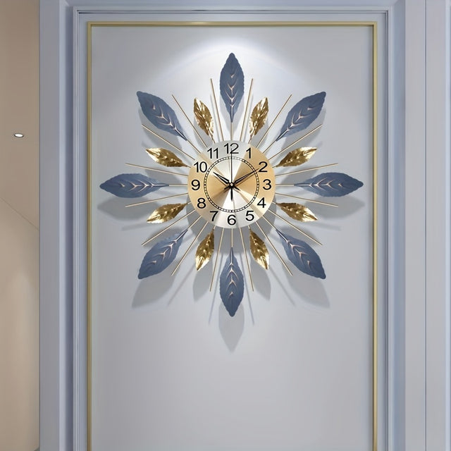 Elegant Blue and Golden Leaf Design Wall Clock, 55cm - Silent, Mechanical Movement, Metal Frame with Auto-Shut-Off Feature, Requires 1 AA Battery (Not Included), Decorative Clock for Home, Office, or Living Room