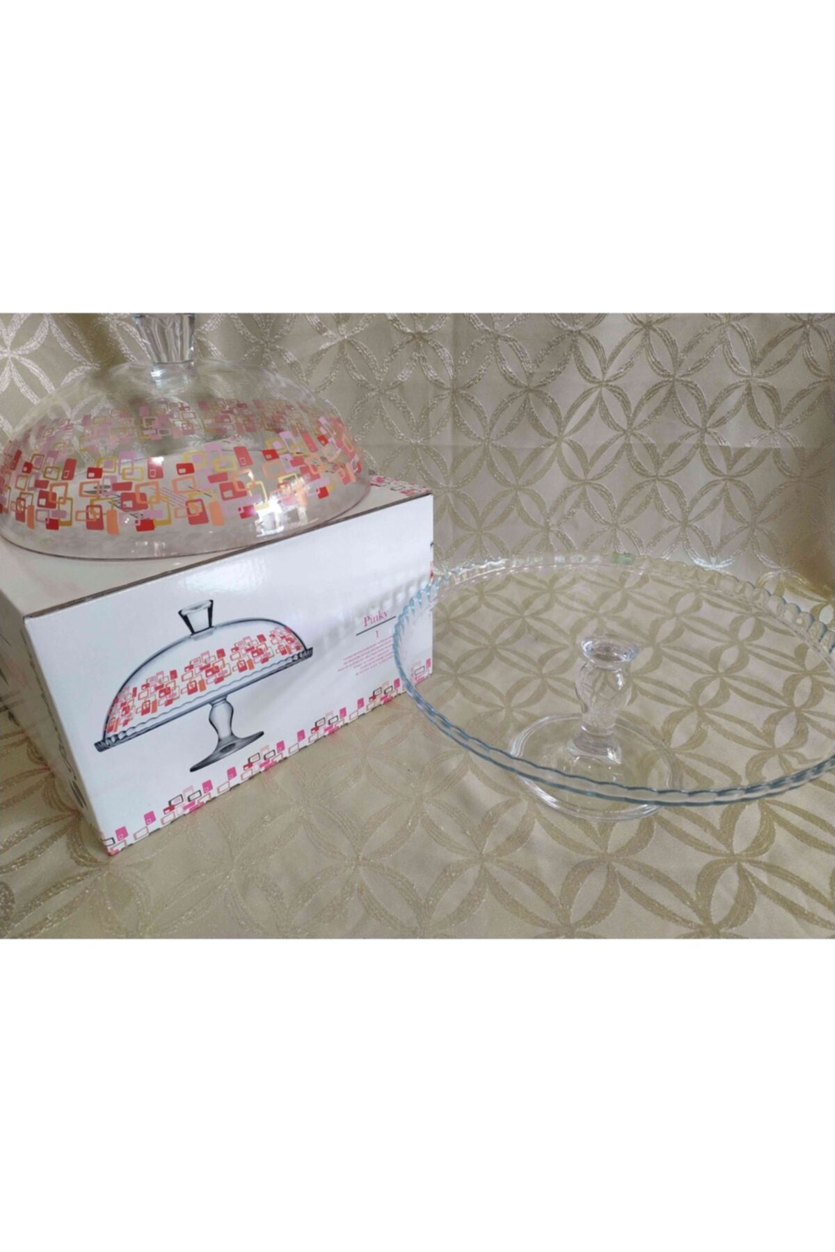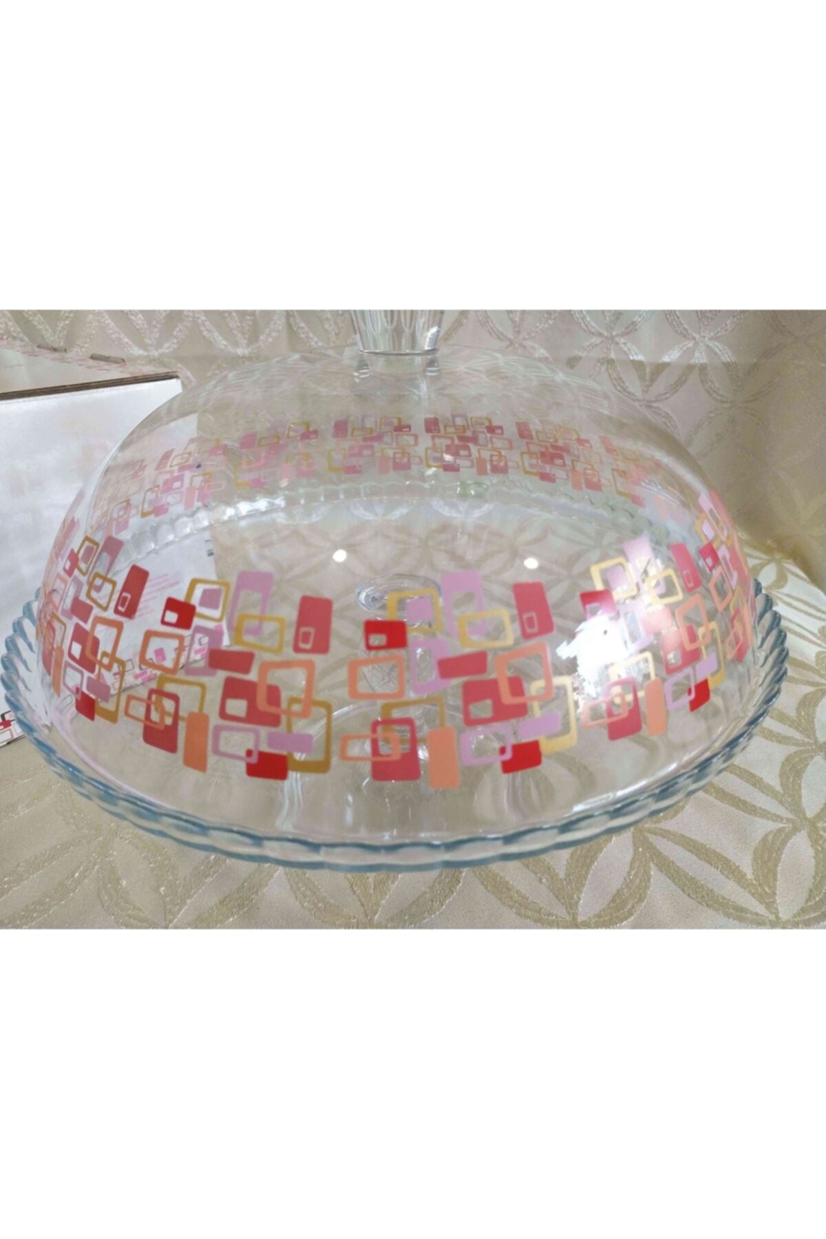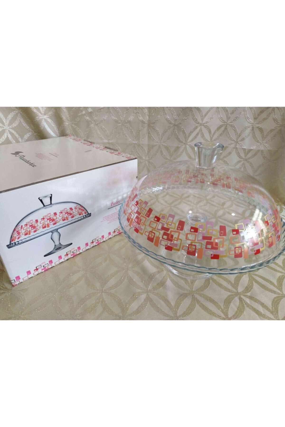 Paşabahçe footed glass cake bowl with lid, geometric pink patterns on transparent background, 32cm Improved version for clearer understanding and better search visibility. Suitable for users seeking detailed and reliable product information.