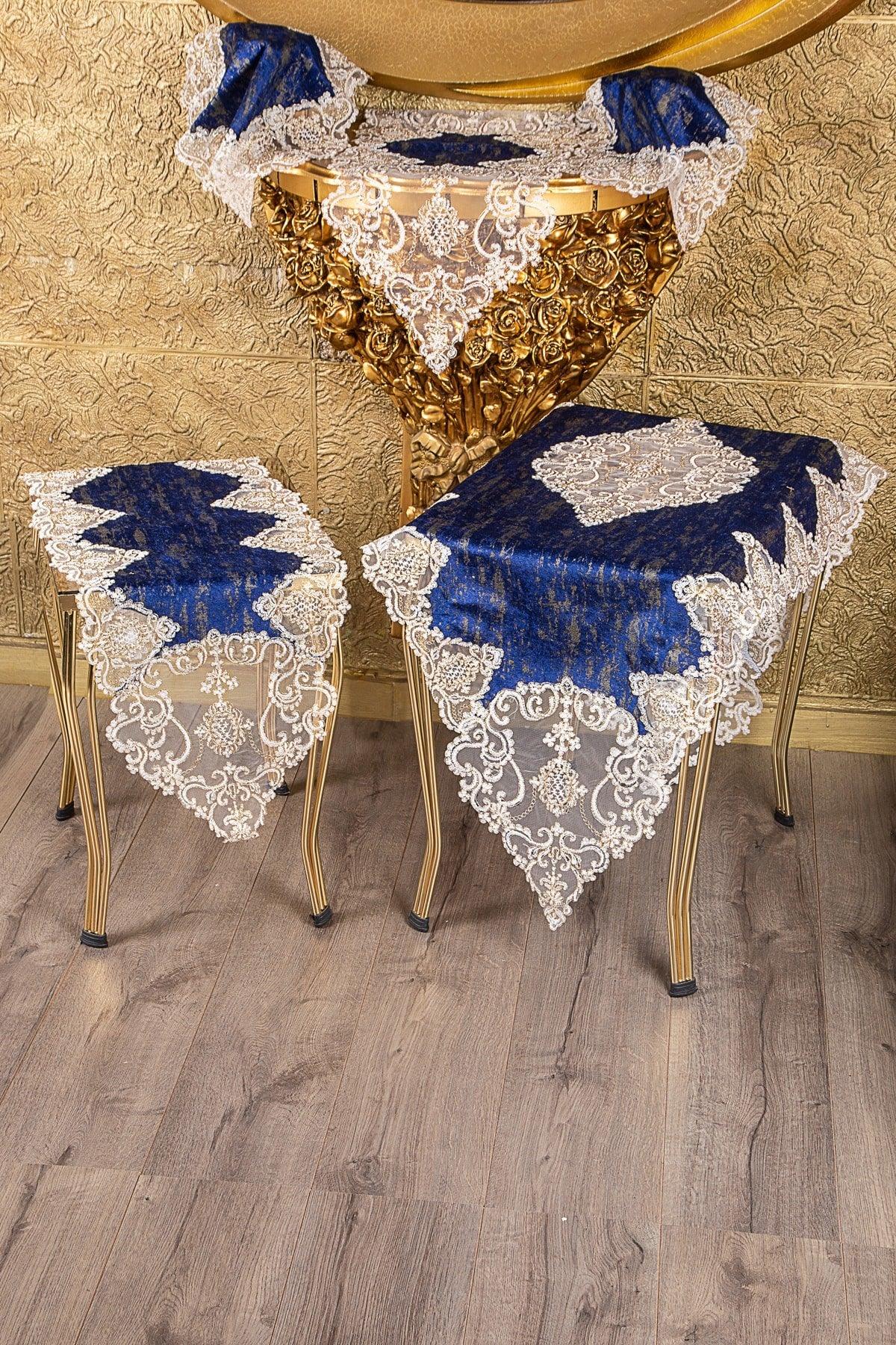 Hürrem Mavi Gardenia 5 Parça Oturma Odası Seti Altın Dantel Masa Bezi Koşucu Seti