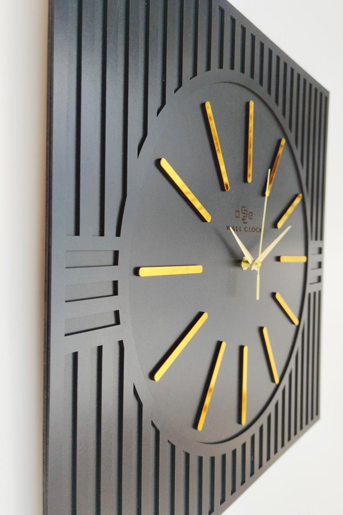 Kare çizgi desenli dekoratif siyah ve altın duvar saati