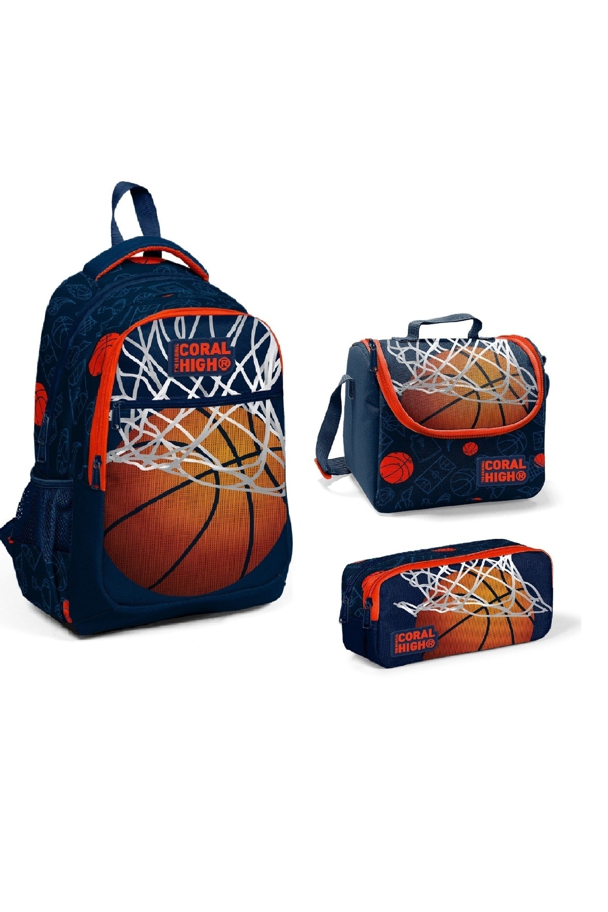 Kids Navy Blue Orange Basketball Patterned Three-Pack Bag Set