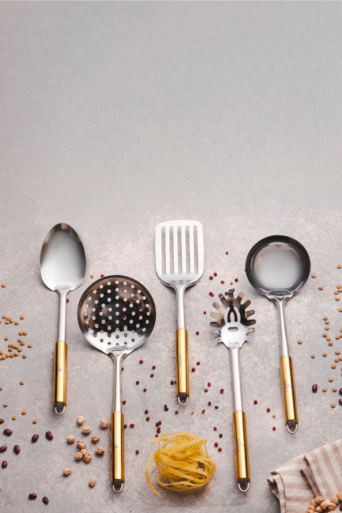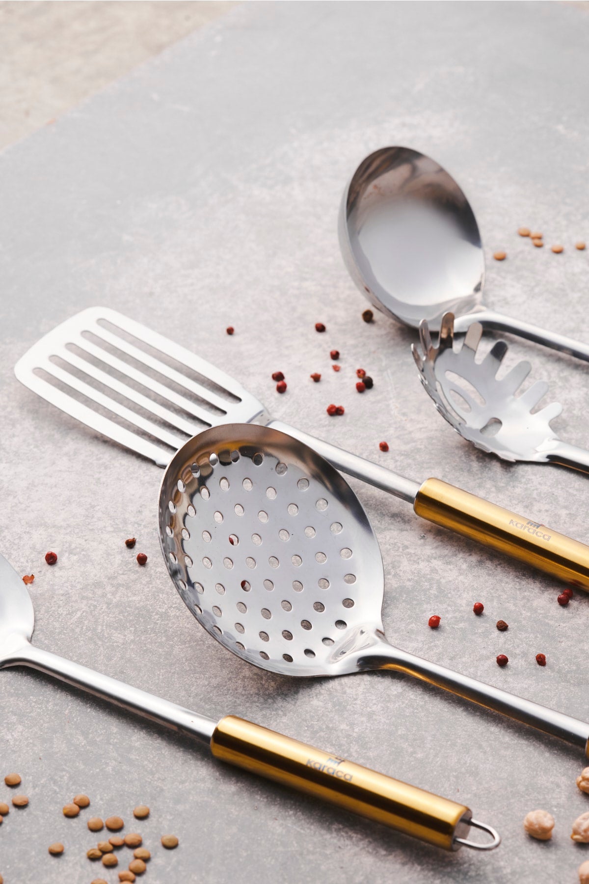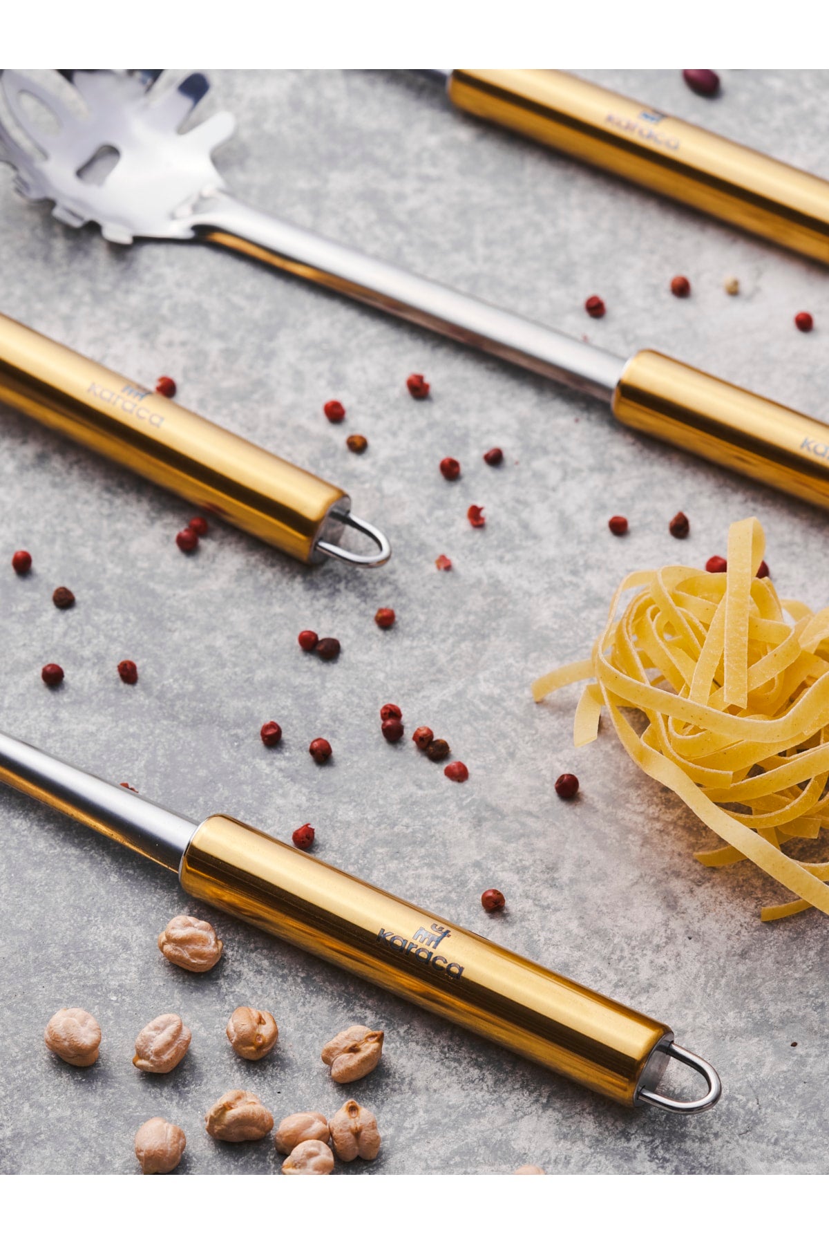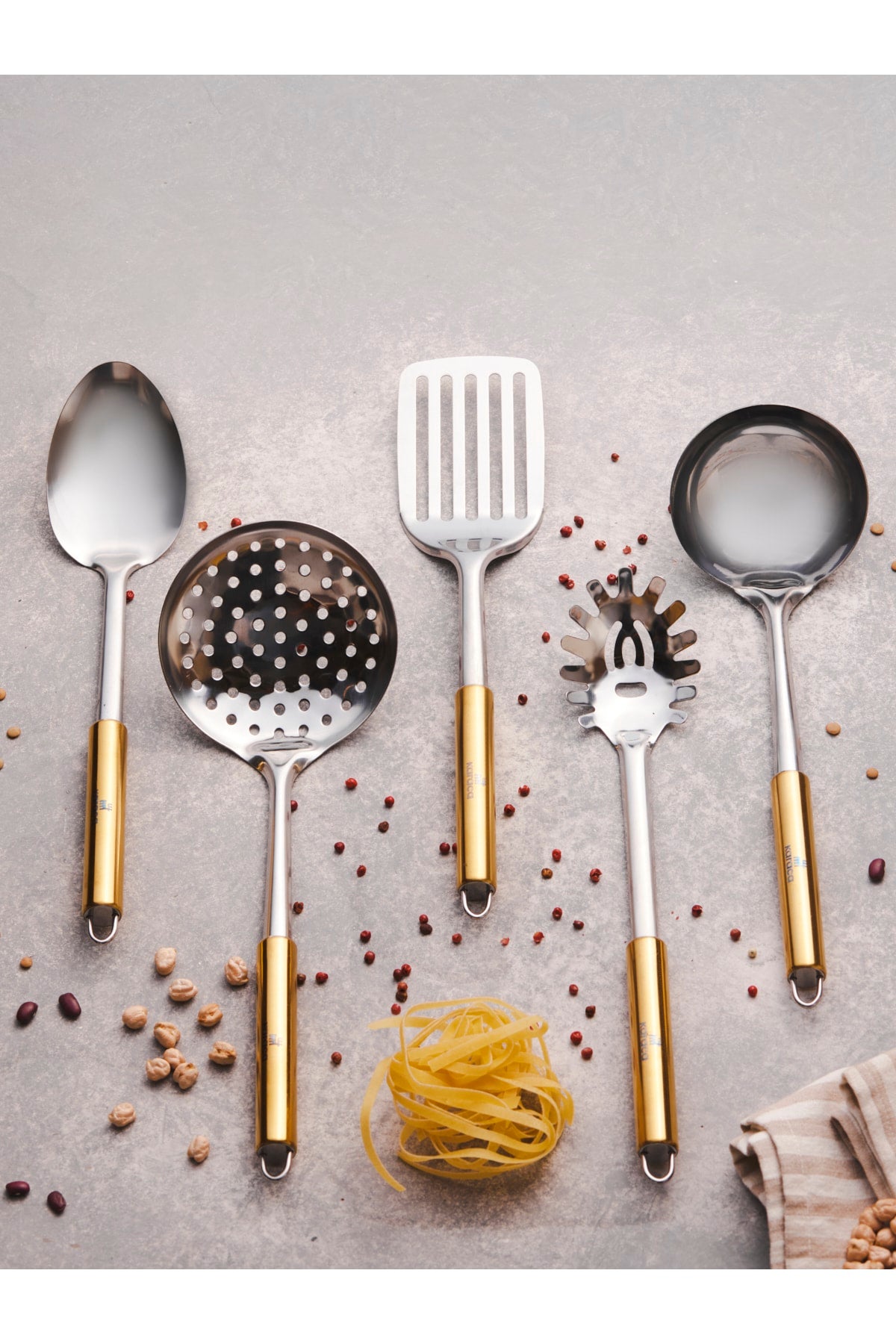 Karaca master gold 5 pieces serving set set contents 1 colander 33cm1 piece scoop 32cm1 piece corrugated serving spoon 33.5cm1 piece slotted spatula 33.5cm1 pieces pasta spoon 31,5cmmaterial: stainless steel karaca master 5-piece serving set features kitchen tools are long enough for intense hustle and bustle time must last. karaca master gold 5-piece service set is produced from stainless steel, which provides long-lasting use. stainless steel material is antibacterial. the products are non-staining. unlike other metals, stainless steel does not change the color, smell or taste of foods. it can also prevent toxic substances and chemicals from contaminating your food. this feature makes the service set great for homes with large families, children, the elderly and animals. therefore, karaca products are often preferred in kitchens for long periods. food service set includes perforated spatula, ladle, serving spoon, colander and pasta spoon. when you buy the karaca service set, you get a product set suitable for versatile use at once. you can cheer up your tables with the elegance of the set while presenting all kinds of dishes. Improved version for clearer understanding and better search visibility. Suitable for users seeking detailed and reliable product information.