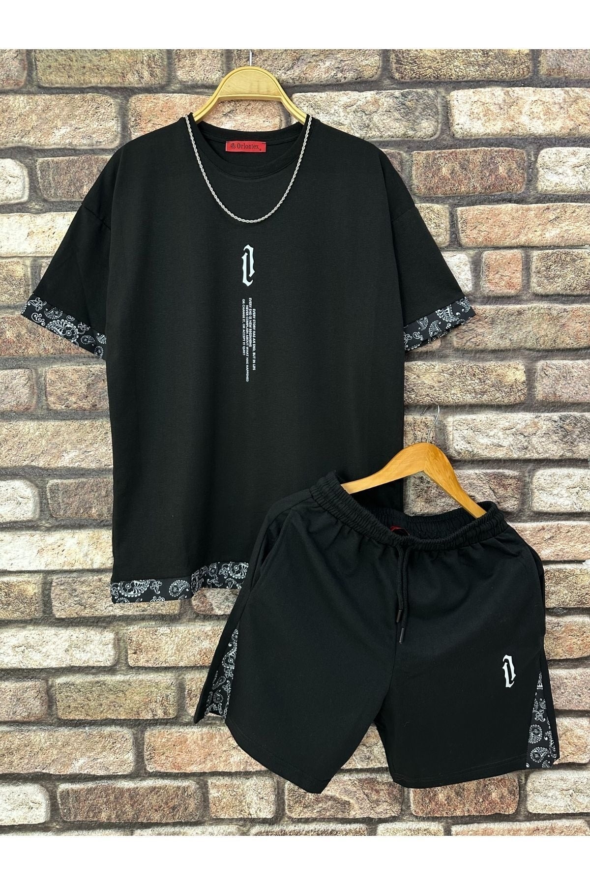 Men'S Black Vertical Printed Oversize T-Shirt Shorts