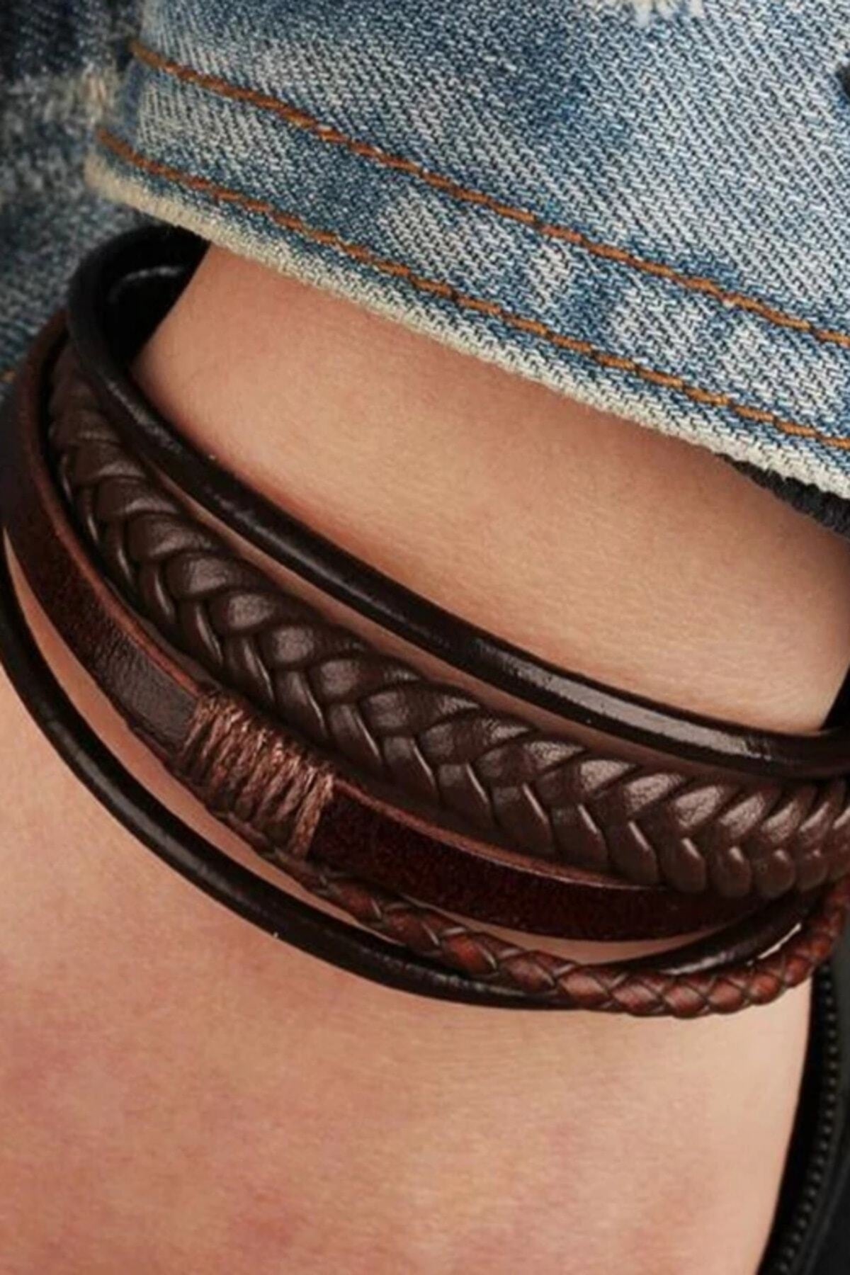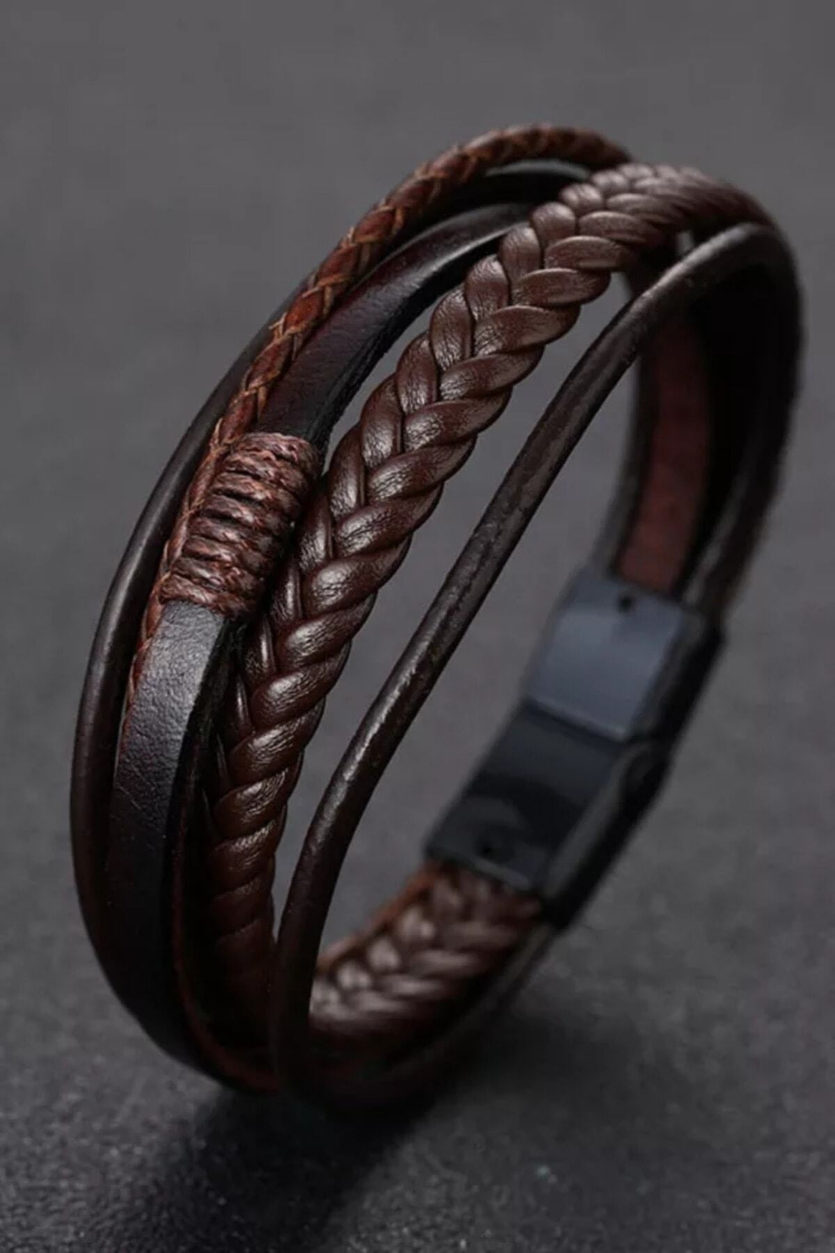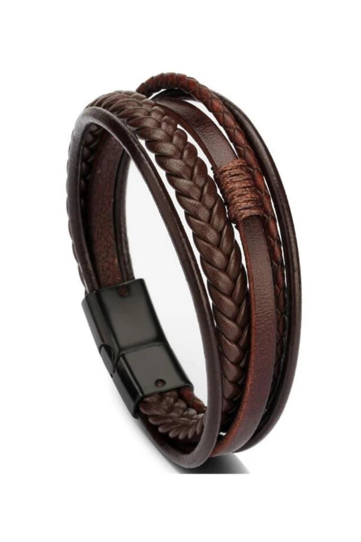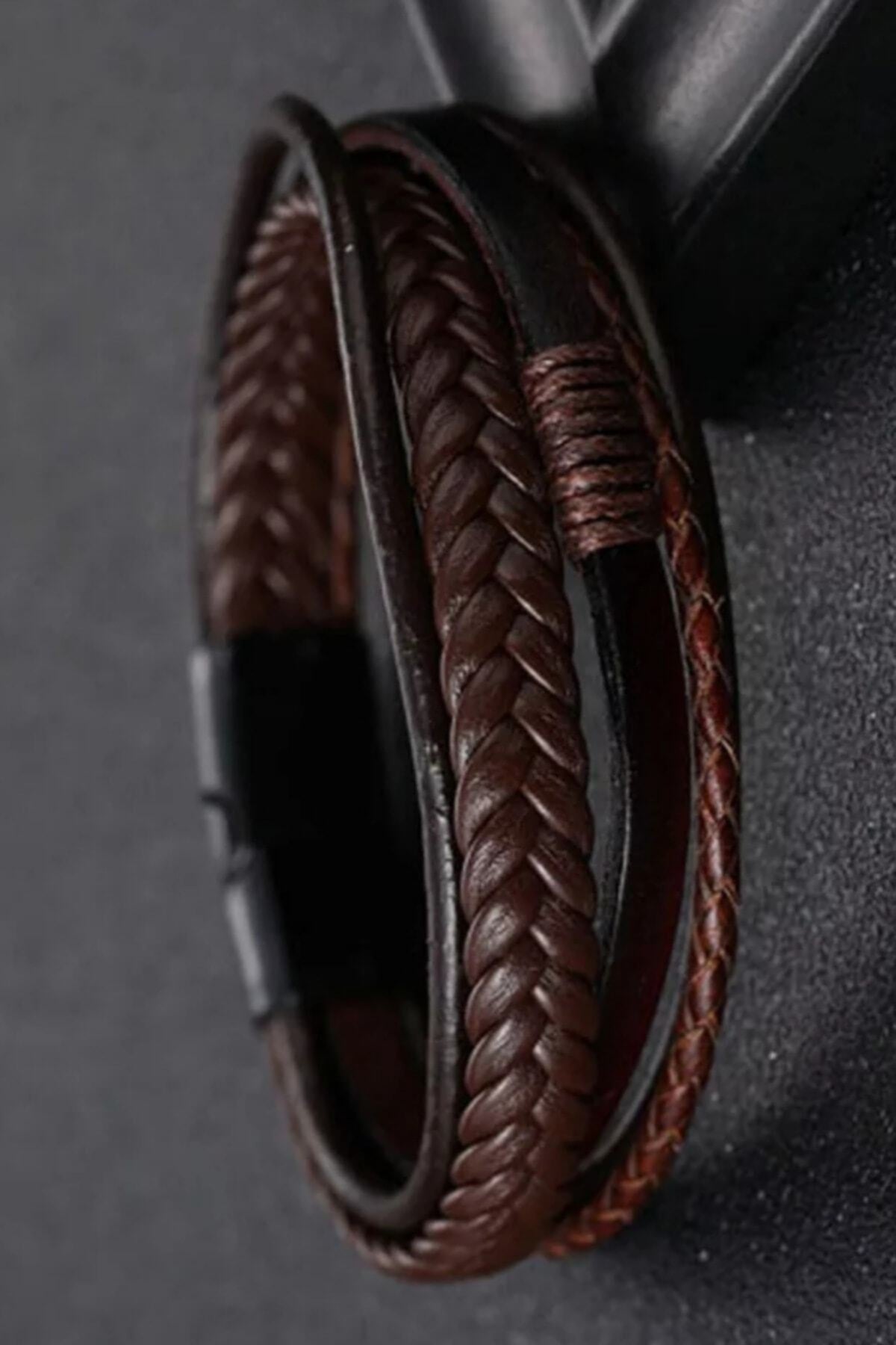 Men'S Genuine Leather Bracelet Brown Color Magnetic Clasp Braided Bracelet