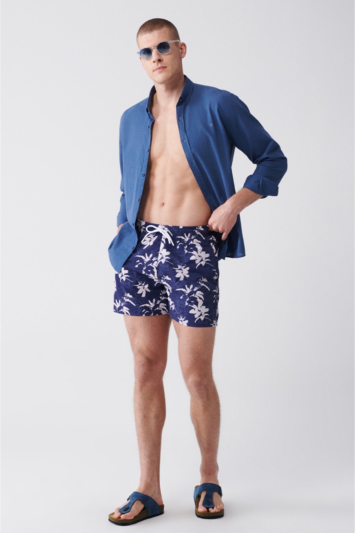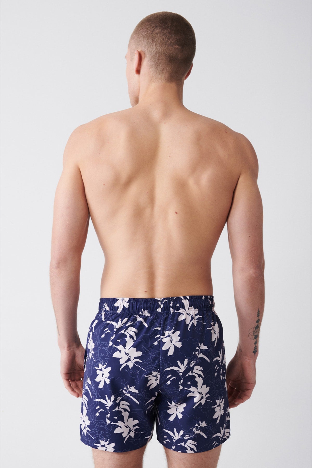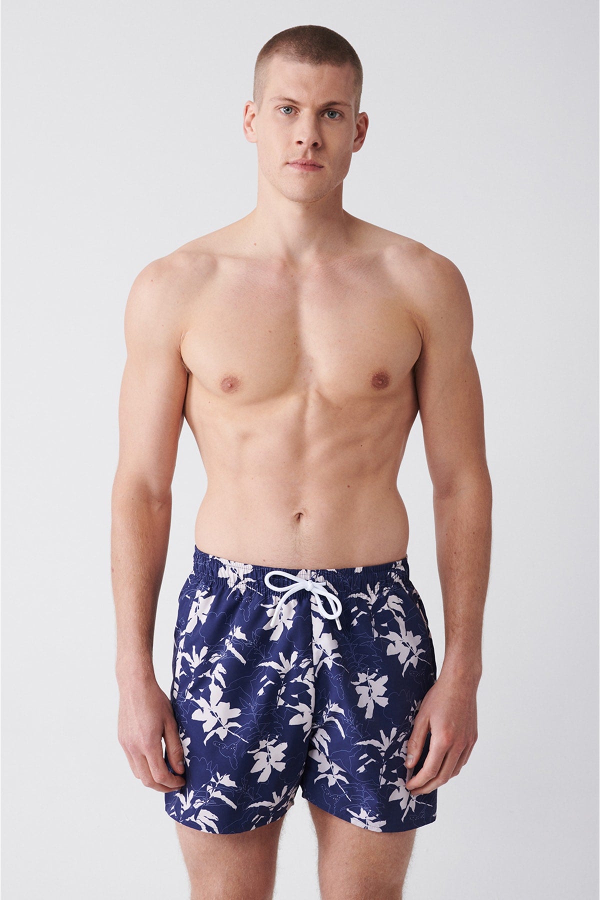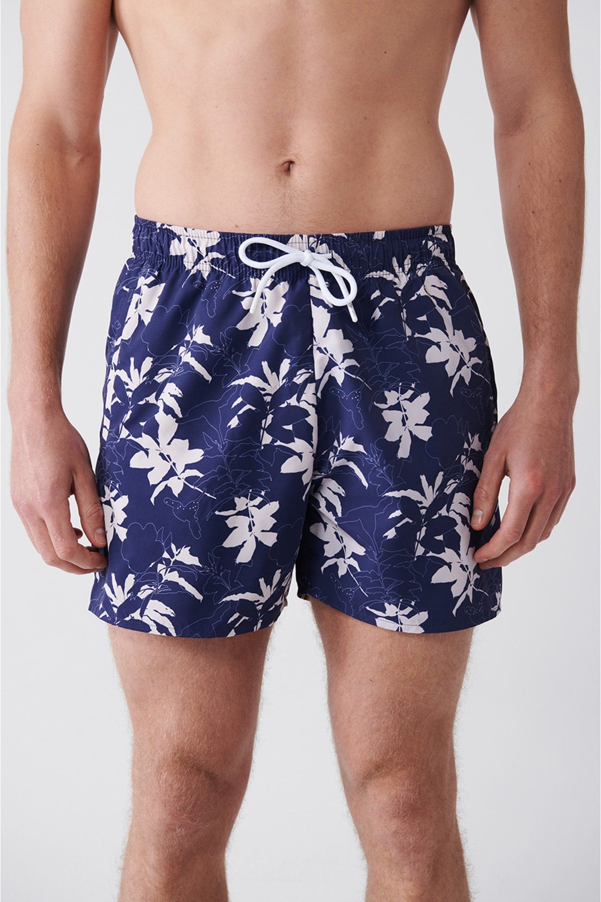 Men'S White-Navy Blue Quick Dry Printed Standard Size Swimwear Marine Shorts E003802