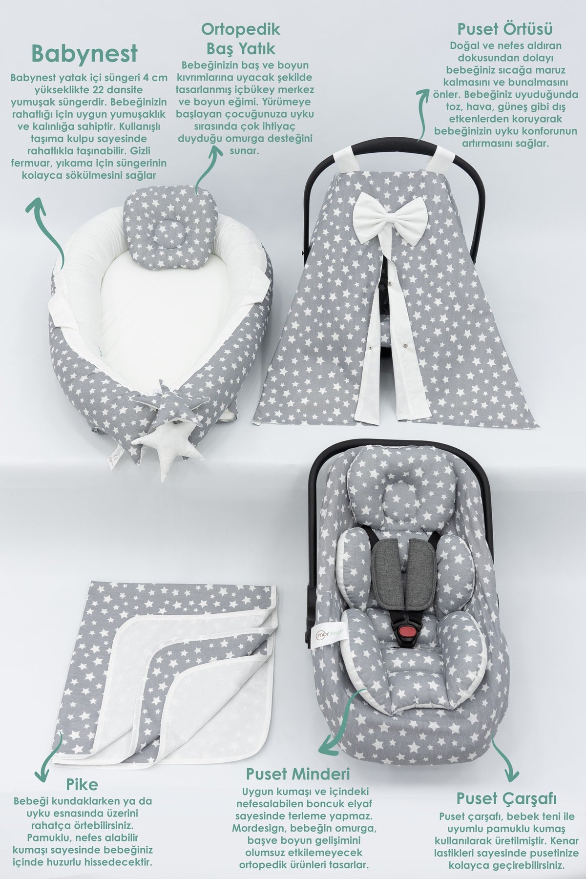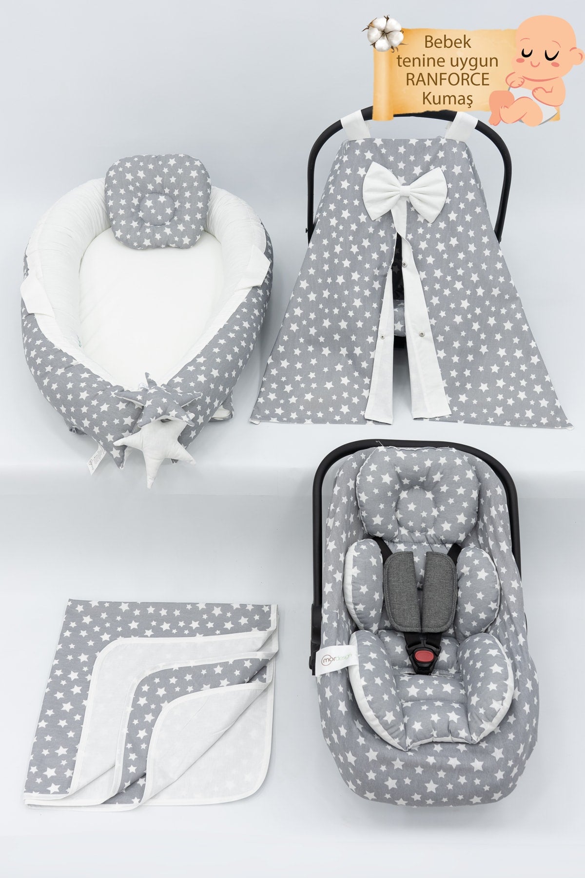 Orthopedic Baby Mattress, Pique And Stroller Accessories Set Of 6, Gray Color Stars Pattern