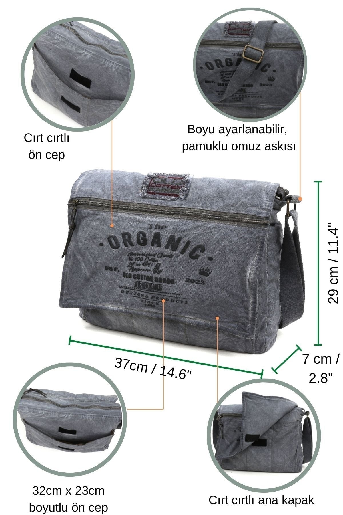 Old cotton cargo 8128 mulater shabby anthracite canvas shoulder messenger laptop school travel daily outdoor vintage washable cotton fabric bag local productioncontent: 93% cotton, 7% polyester velcro and zipper closurevintage style: old cotton cargo messenger bag is made of high quality cotton canvas fabric. since a special washing process was carried out during production, waves were created in the image of the bag in random directions. this gives the model both a vintage feel and helps it gain a shabby look. wide compartment: this cross-shoulder canvas travel bag has one main compartment that closes with a zipper. between the cover and the main compartment, there is a large pocket for your tablet and similar items that can be easily opened and closed with velcro. there are two pockets in the main compartment for your wallet etc. there is another big pocket on the main cover that can be opened and closed with a zipper so that you can store your belongings that you want to reach easily while carrying the bag on your shoulder. salas & comfortable: this school bag with cotton fabric, which has been given a vintage look with a special wash, has a shabby structure. due to its dimensions, it is both suitable for daily use and an indispensable helper for travels. this model offers the opportunity to conveniently store your 14” and smaller laptops and tablets. the connection between the shoulder strap and the bag is made to increase durability. the cotton and adjustable shoulder strap provides a very comfortable carrying opportunity. external dimensions: 37 x 29 x 7cm / 14.6 x 11.4 x 2.8 inch (wxlxw). capacity: 7.5 liters. dimensions of the velcro pocket under the front cover: 32 x 23cm / 12.6 x 9.1 inches. the zippered pocket on the main cover is 34 x 17cm / 13.4 x 6.7 inches. there are two pockets in the main compartment, measuring 14 x 14cm / 5.5 x 5.5 inches. shoulder strap sizes: 70 - 140cm / 27.6 - 55.1inch. strap width: 4cm / 1.6inch. weight: 0.44kg / 0.97lb. perfect gift: the old cotton cargo shoulder bag is a very suitable bag for casual lovers and stylish people. it is ideal for shopping, travel, high school and university use. perfect for any occasion as a gift and so on. Improved version for clearer understanding and better search visibility. Suitable for users seeking detailed and reliable product information.