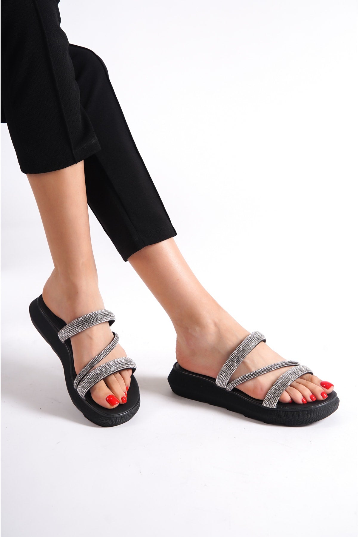 Women'S Black Flat Sole Stone Stylish Slippers Wsb0494