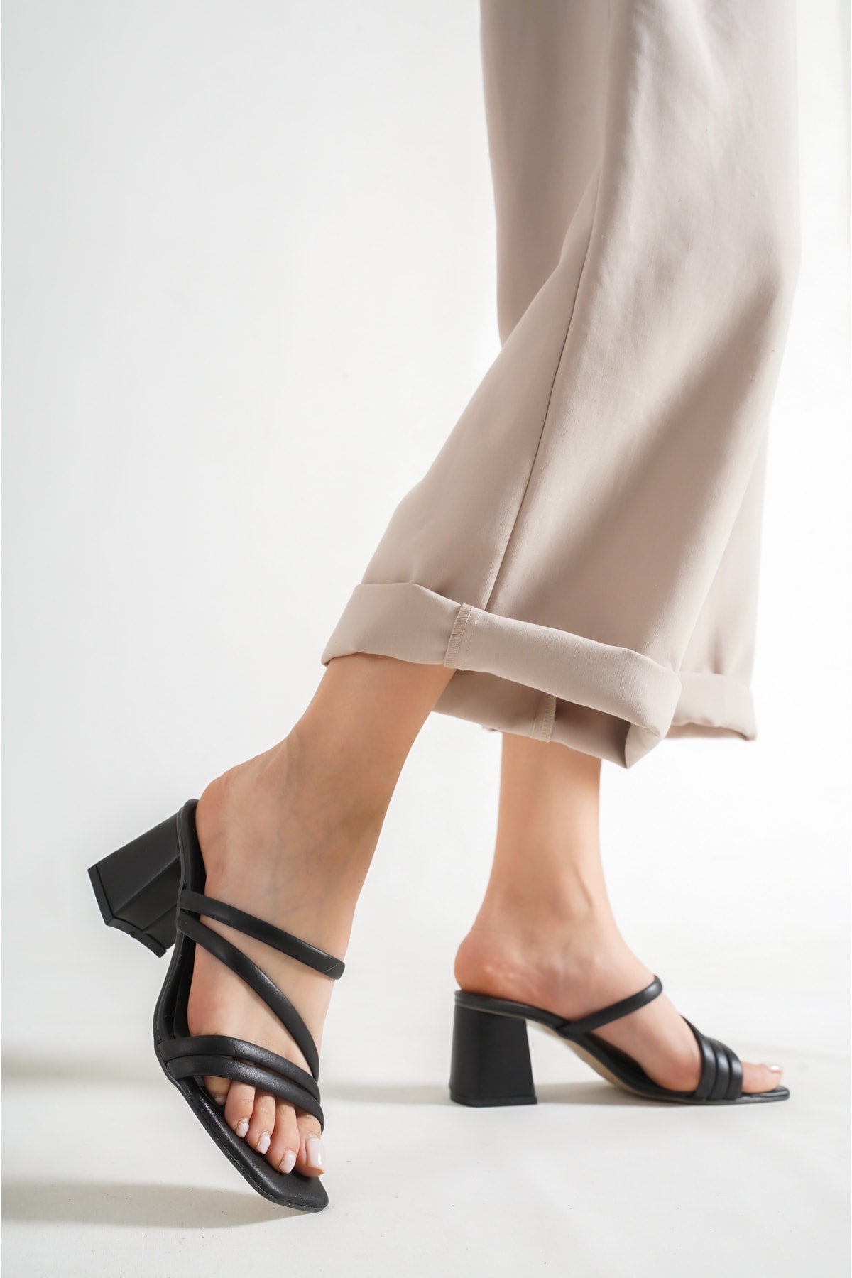 Women'S Black Leather Heeled Slippers Sandals Ba20888