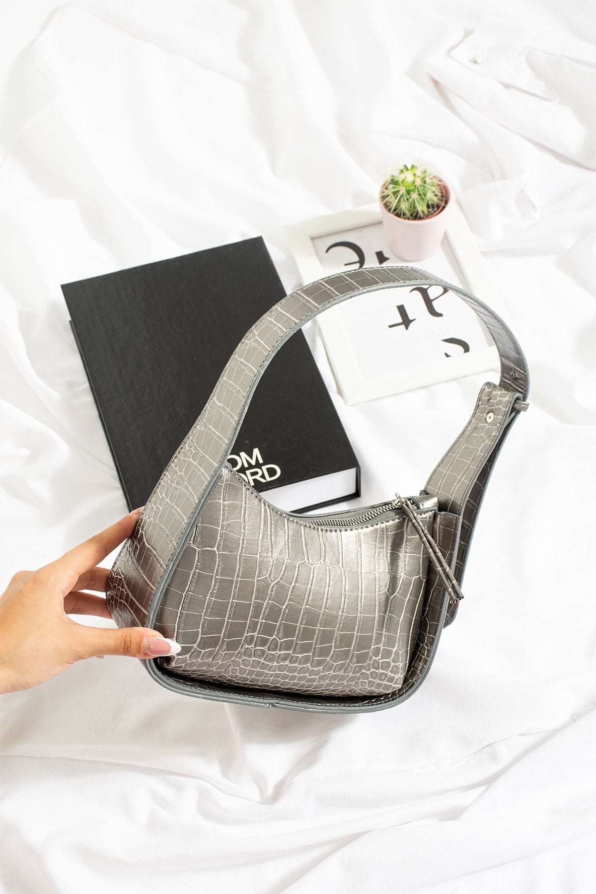 Women'S Crocodile Patterned Metallic Gray Baguette Bag