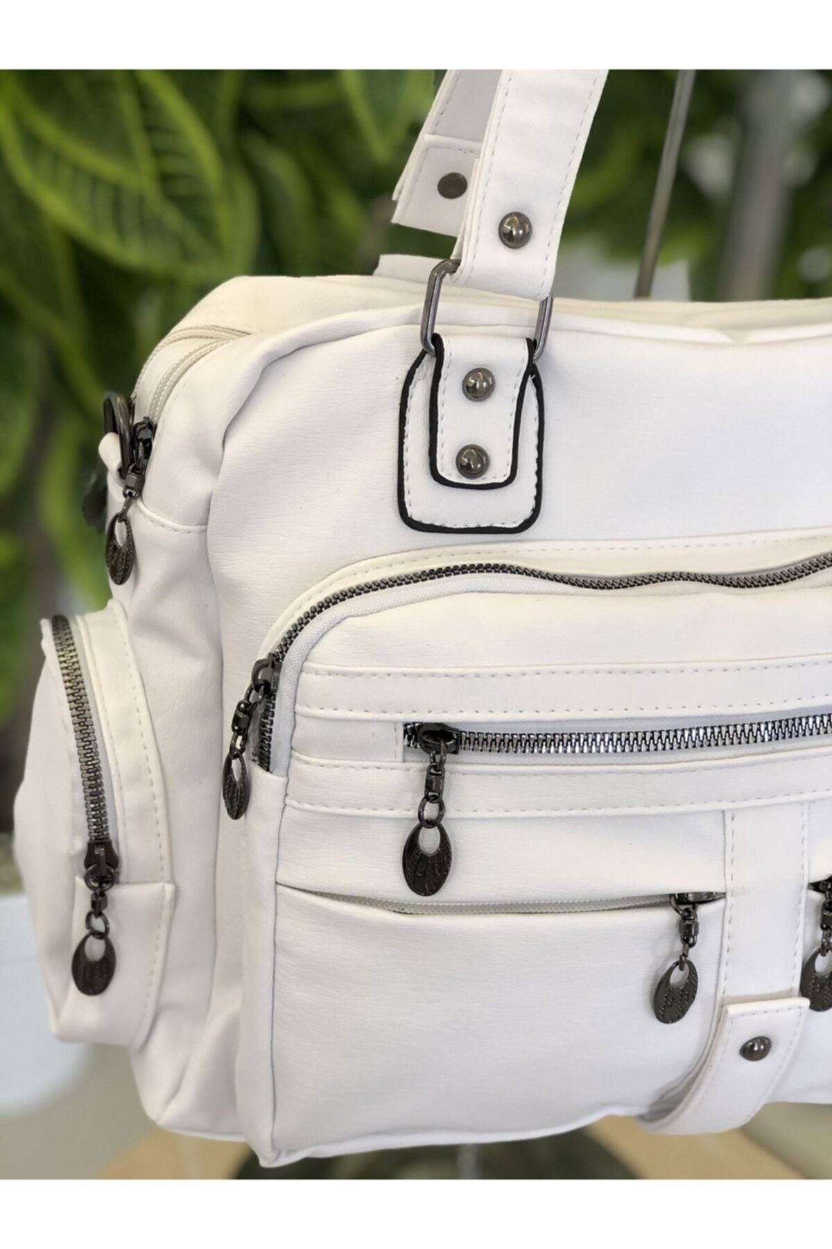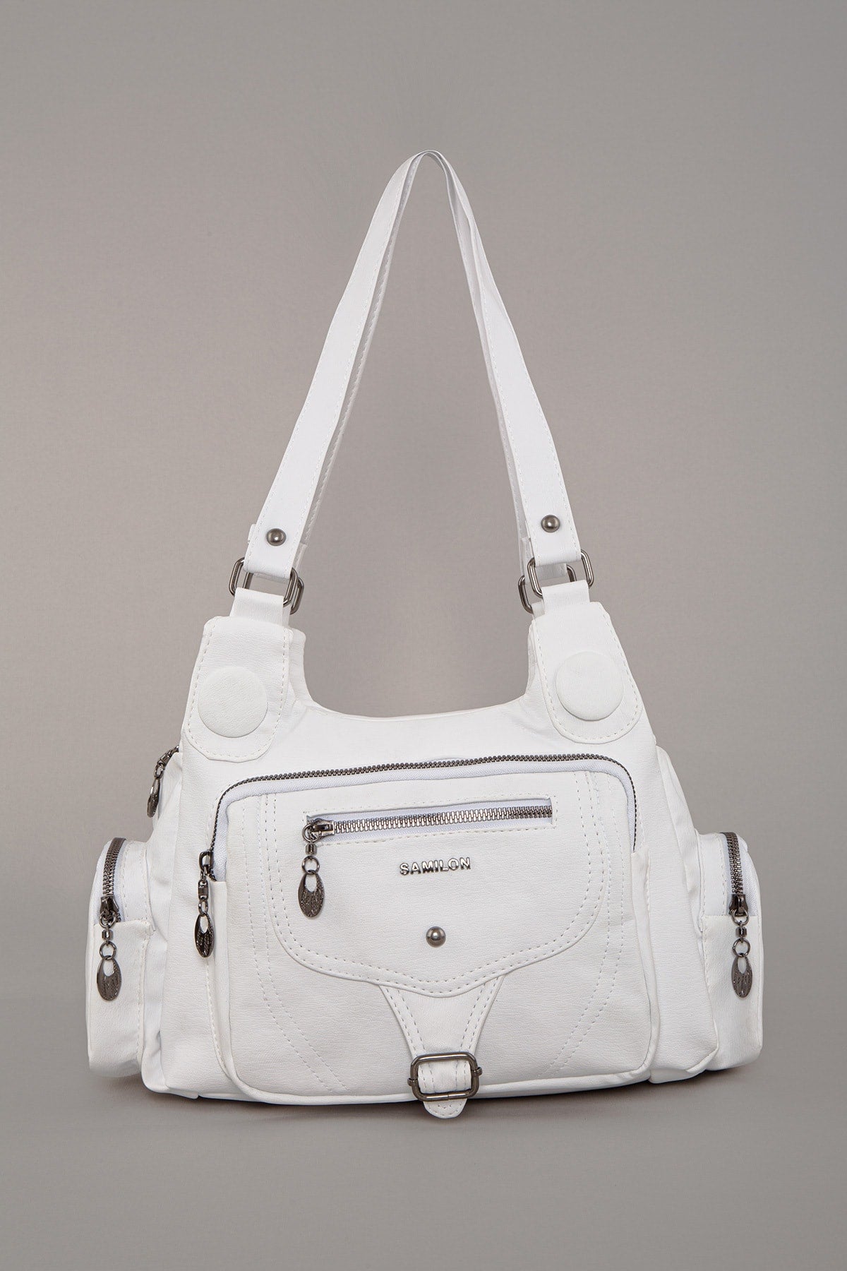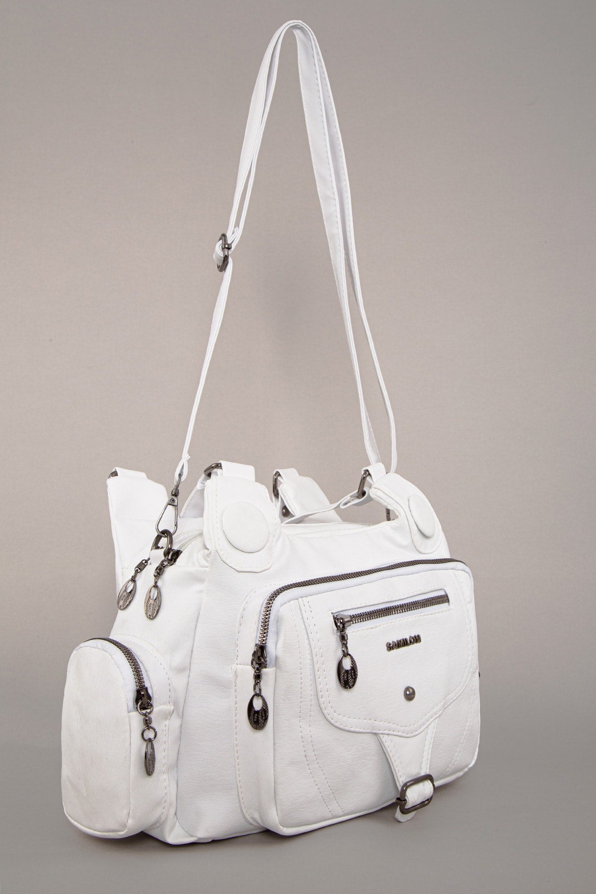Women'S White Wash Leather Multi-Section Shoulder And Hand Bag